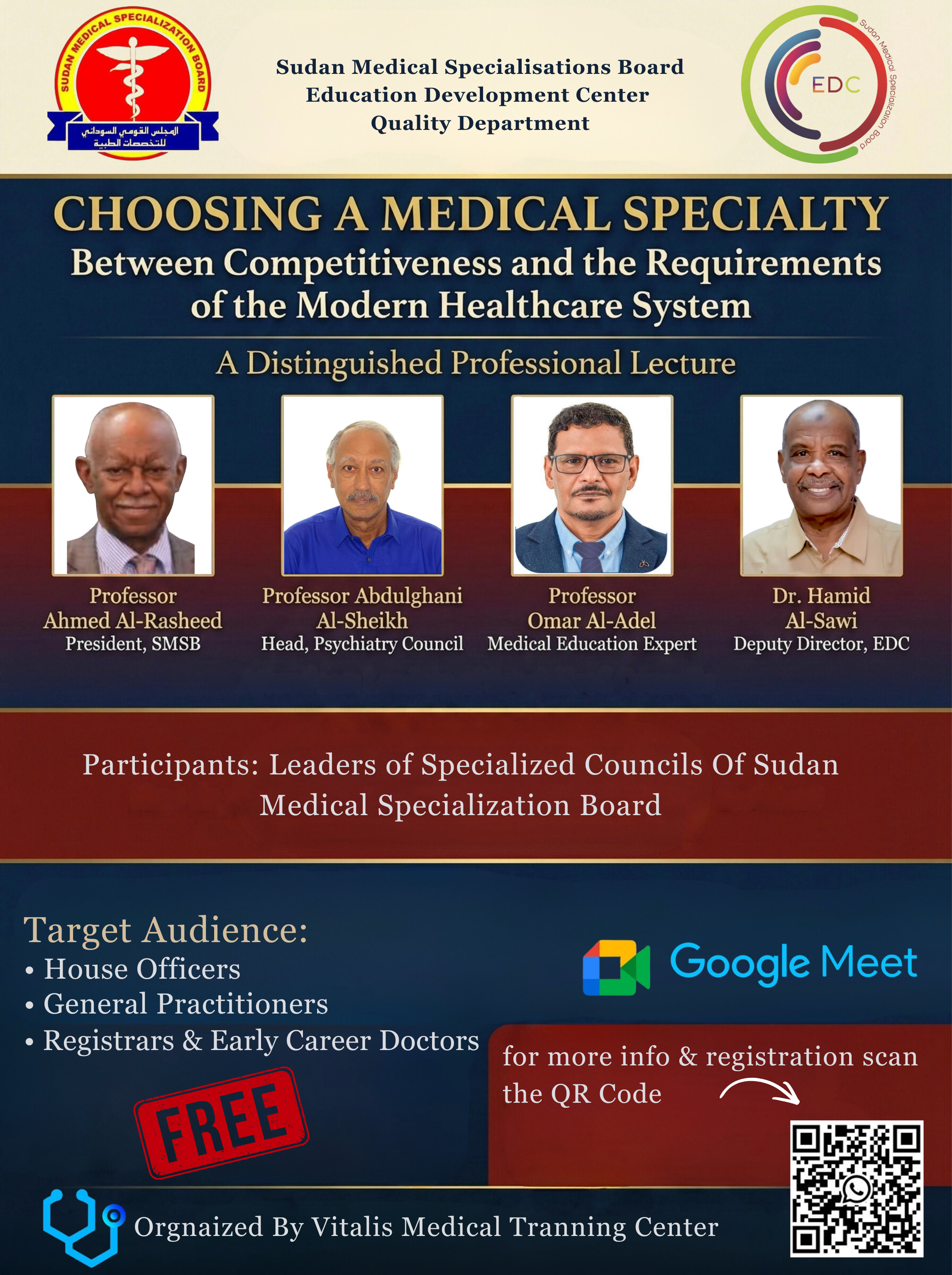 يقدم المحاضره: • بروفيسور أحمد الرشيد – رئيس المجلس القومي السوداني للتخصصات الطبية • بروفيسور عبدالغني الشيخ – رئيس مجلس تخصص الطب النفسي • بروفيسور عمر العادل – خبير التعليم الطبي • د. حامد الصاوي – نائب مدير مركز تطوير التعليم .